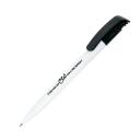 Push button ball pen made from rPET. Solid white barrel and push button with choice of colour clip fitting. Black ink refill.