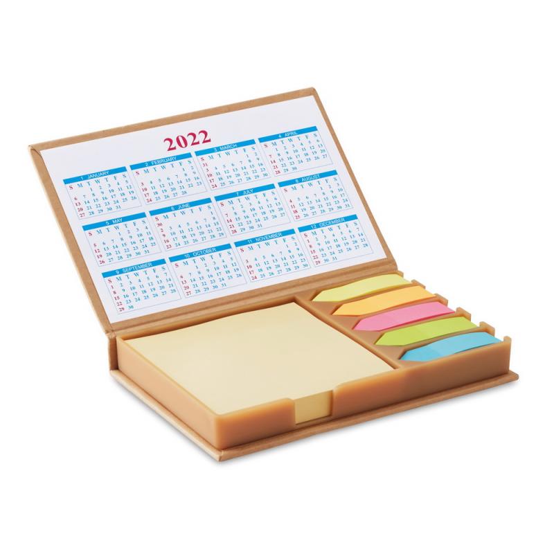 Desk set with coloured page tabs and memo pads. It has a 4 year calendar attached on the inside of the lid.
